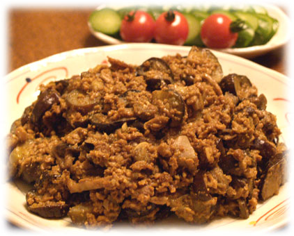 - 香りが出たら、挽肉を入れ、中火でほぐしながら炒める。肉にほぼ火が通ったら、なすを加え火が通るまで炒める。「カレーの壺」を加え全体になじむように炒めて出来上がり!